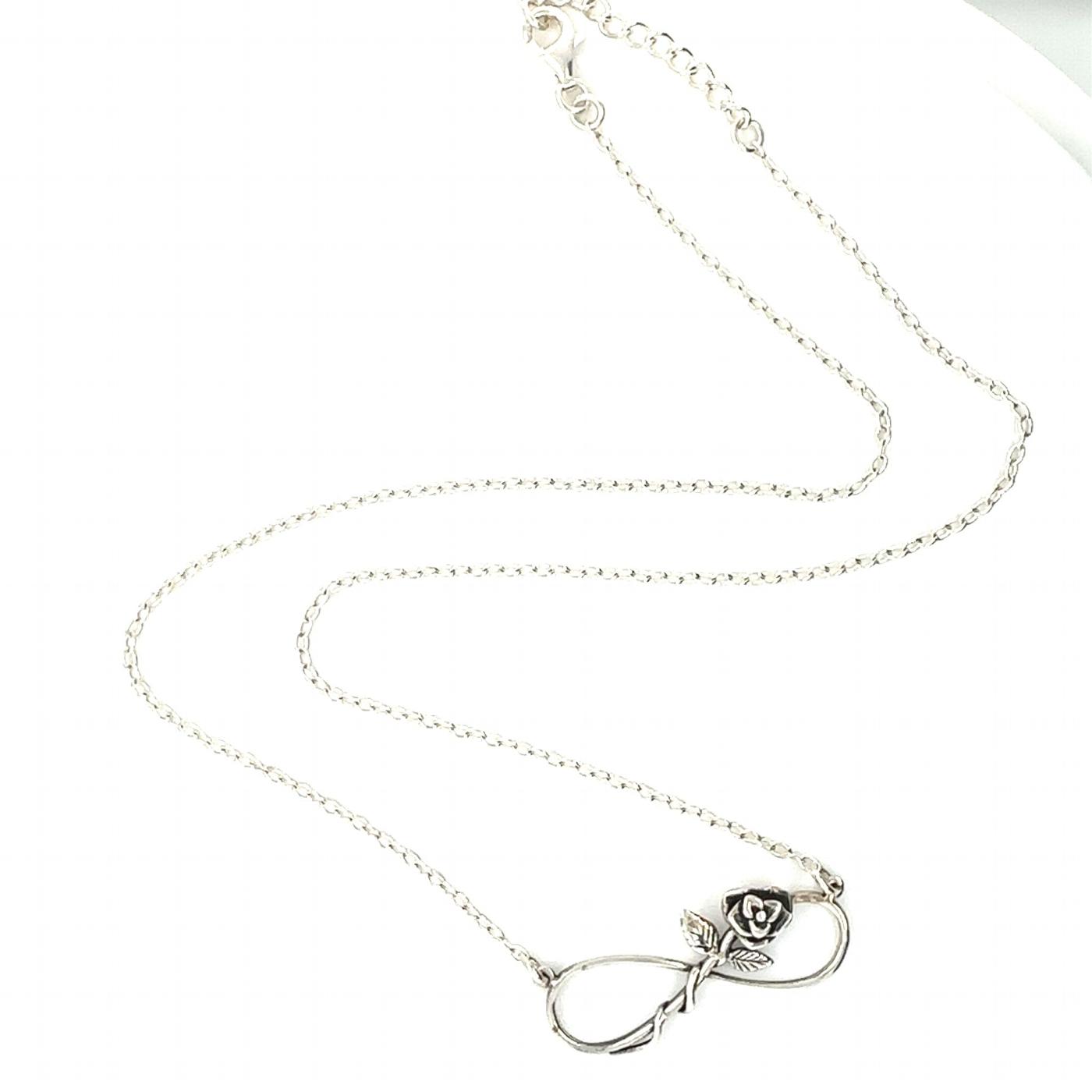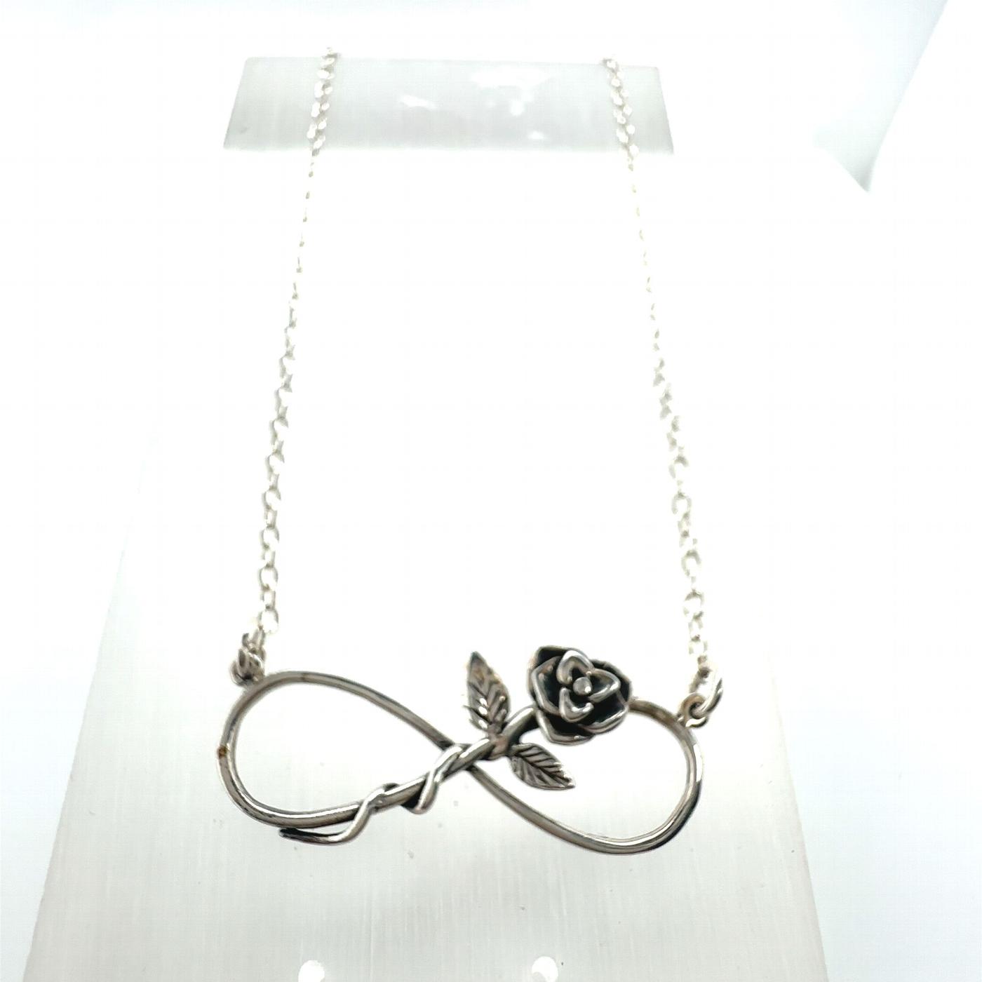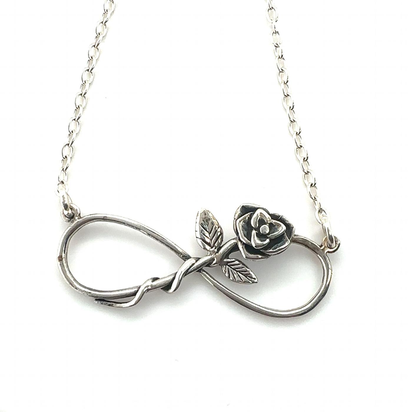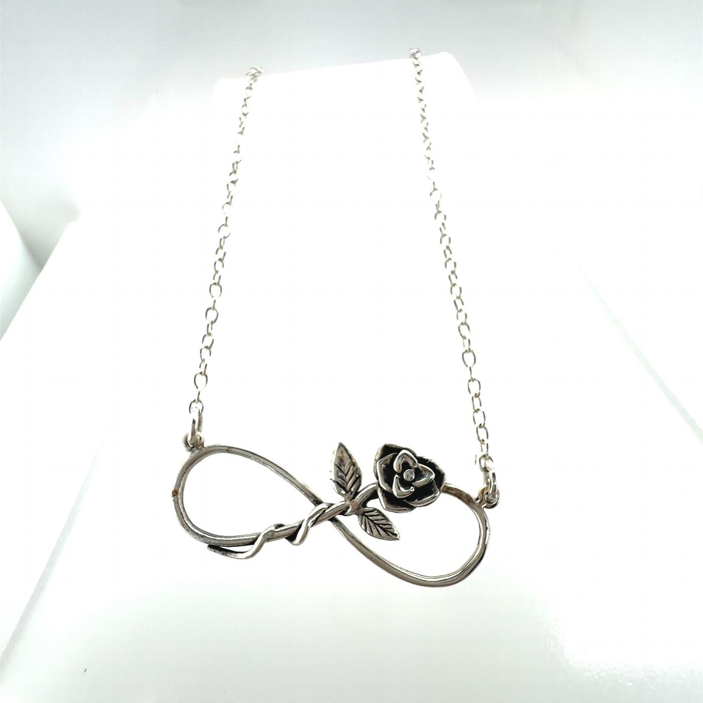 Elegant necklace with infinity and twist rose pendant in sterling silver. A simple yet beautiful design for everyday wear.